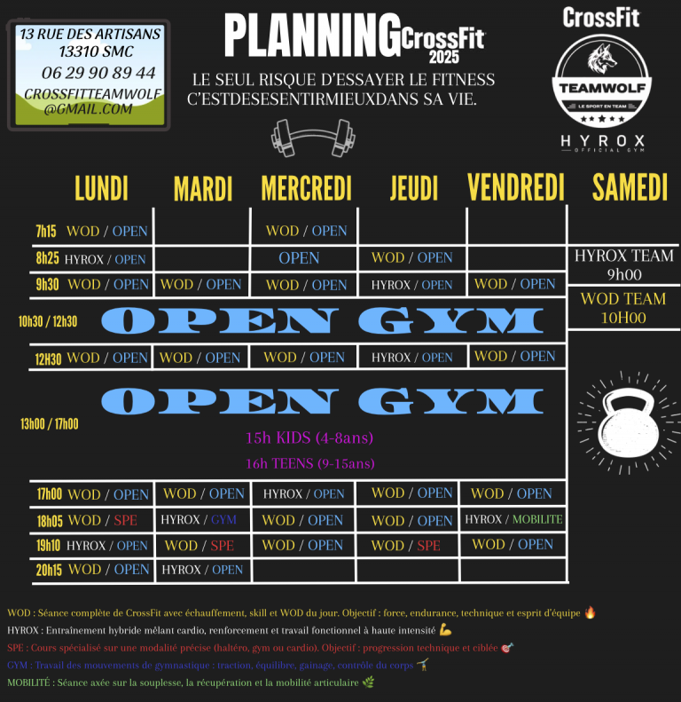 *OPEN GYM : Entrainement en libre service, venez exploiter le matériel afin de vous renforcer.