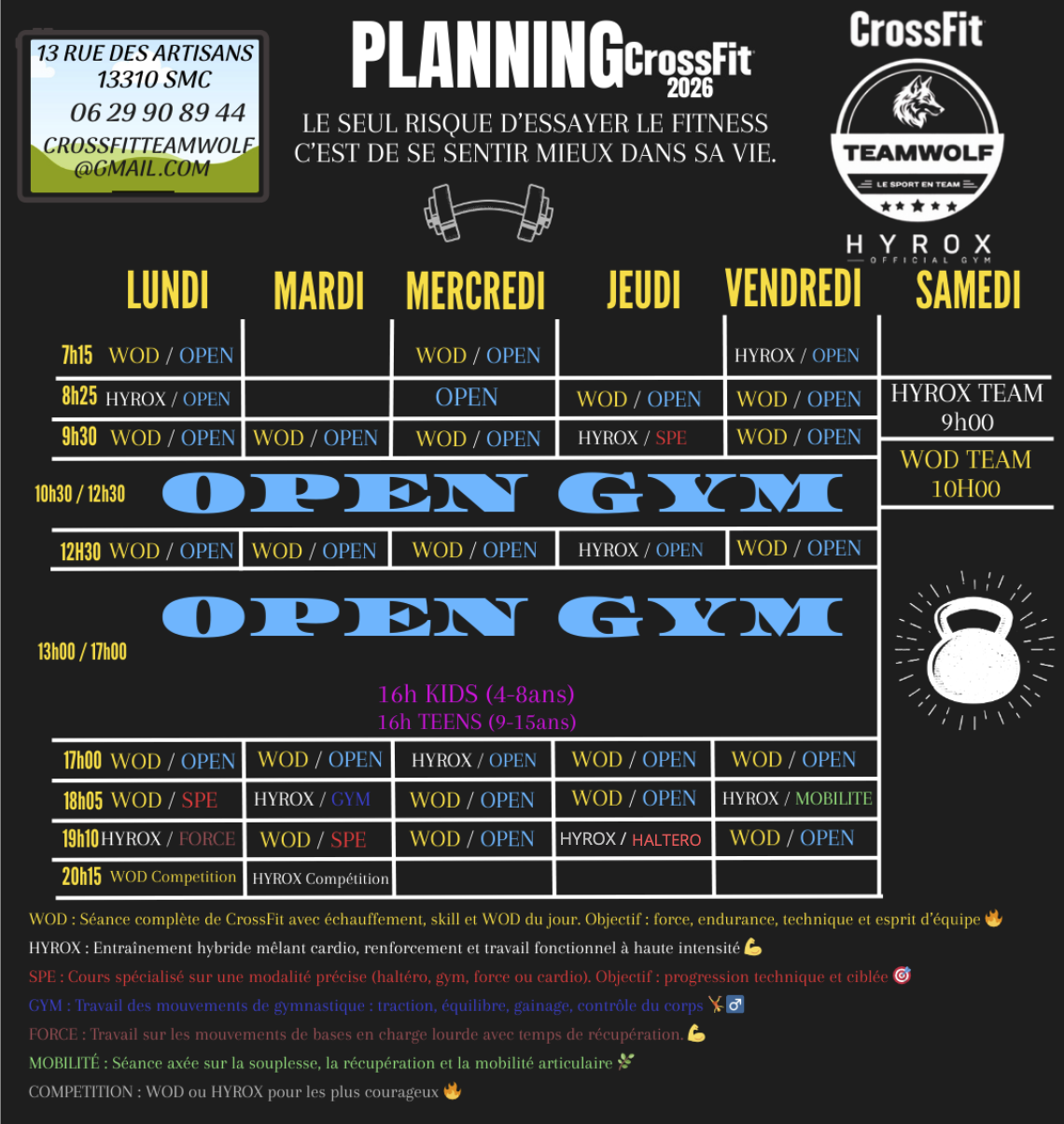 Planning des séances CrossFit et Hyrox à Saint-Martin-de-Crau Nos entraînements sont encadrés par un coach et adaptés à tous les niveaux. Durée d’une séance : 1 heureChaque séance comprend :• briefing du cours • échauffement• apprentissage technique• entraînement du jour• récupération Envie de découvrir l’entraînement ?Venez essayer une séance gratuitement et découvrir l’ambiance de la box. Réserver ma séance d'essai gratuite